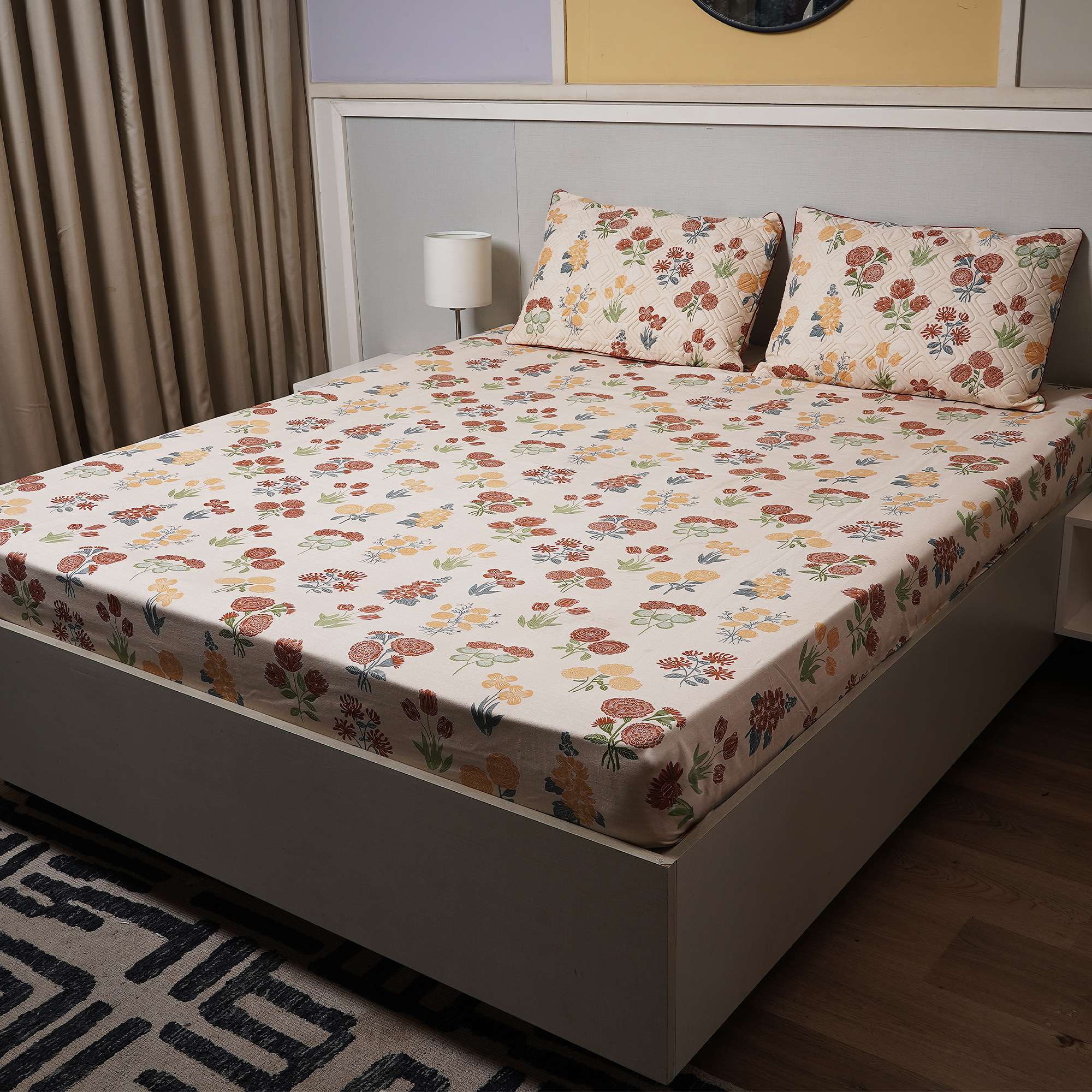A soft ivory base adorned with hand-drawn florals in amber, rust, and sage tones. Quilted detailing adds texture and comfort, making this set ideal for cozy yet elegant everyday bedrooms.