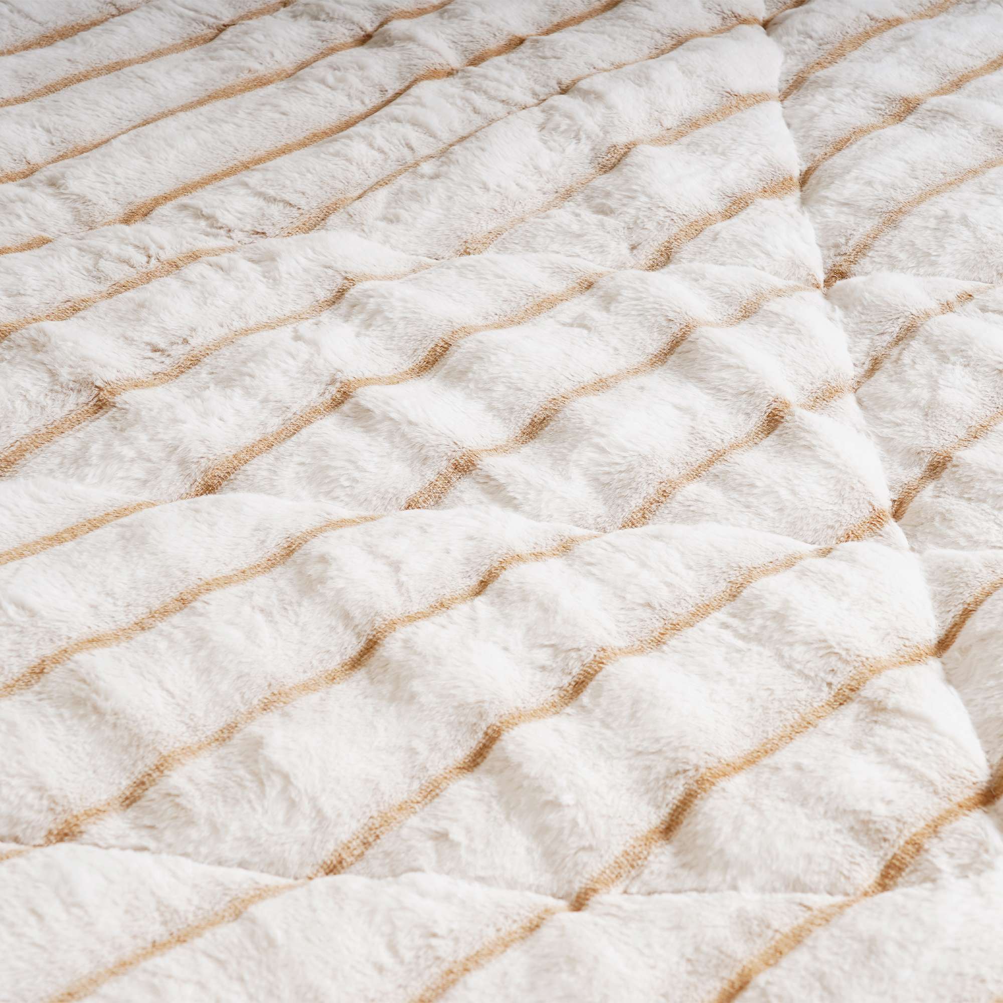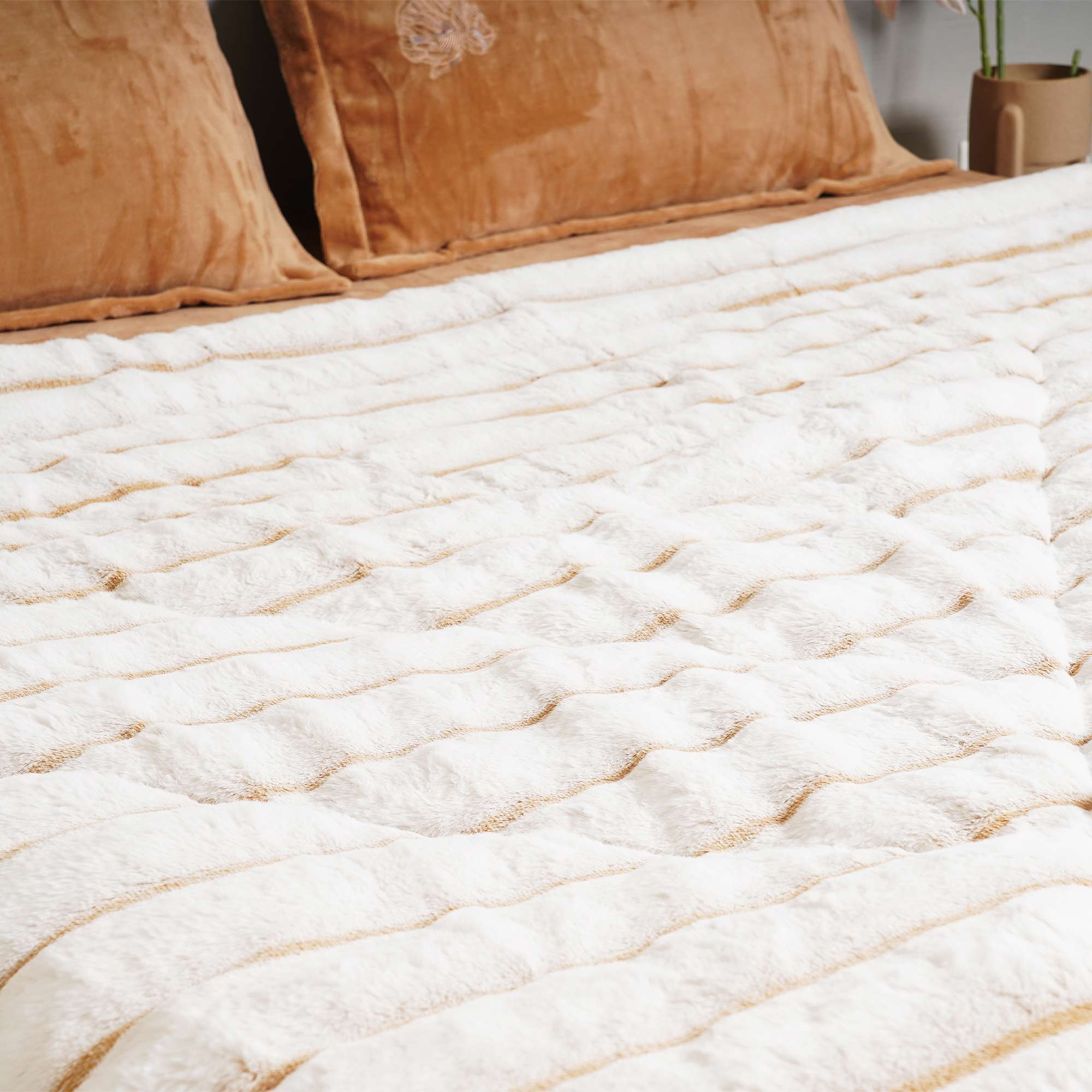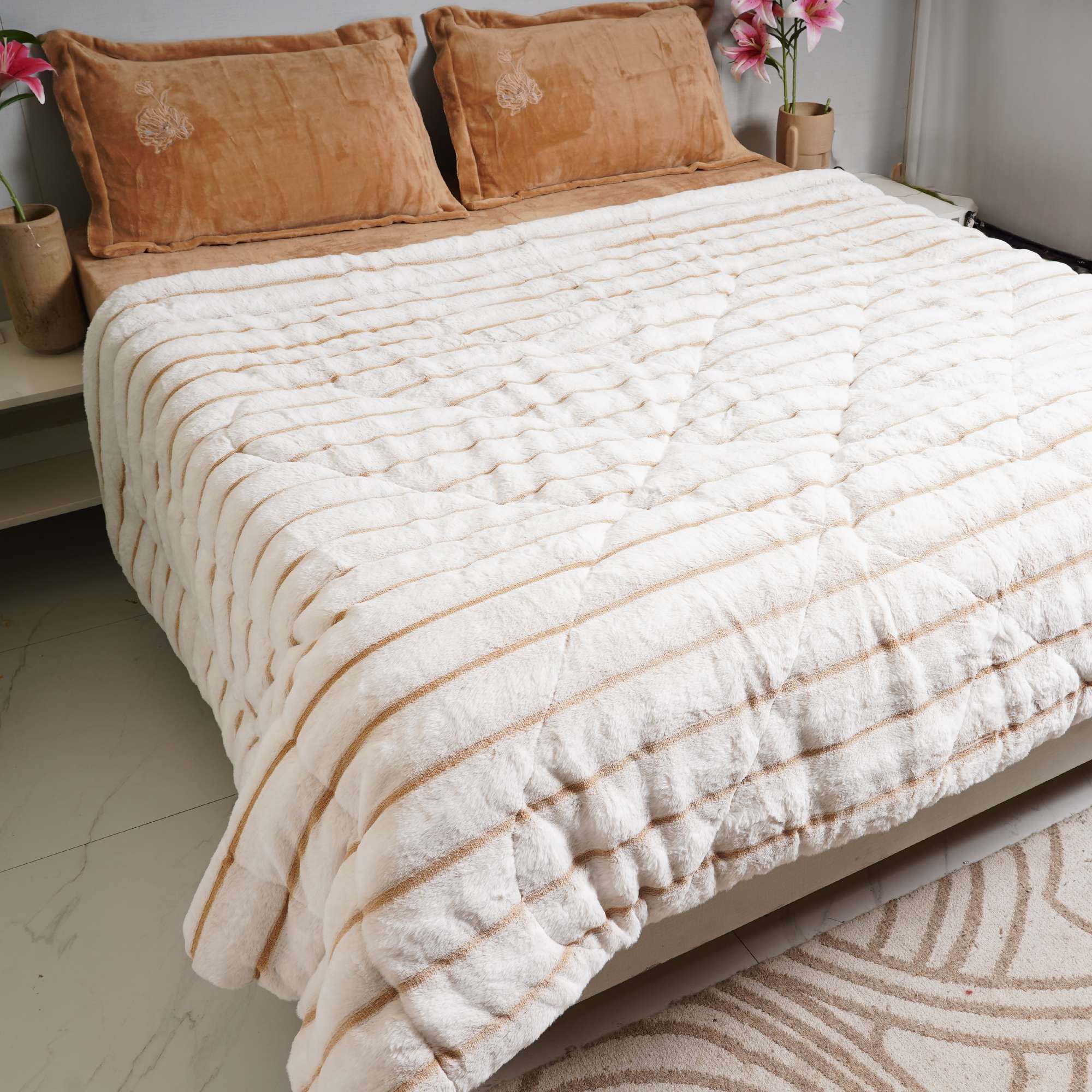 Cloudline Ivory Bed Cover features a plush ivory surface with subtle ribbed detailing. Designed for winter warmth, it offers a cozy, luxurious feel while maintaining a clean, modern aesthetic that drapes beautifully on the bed.