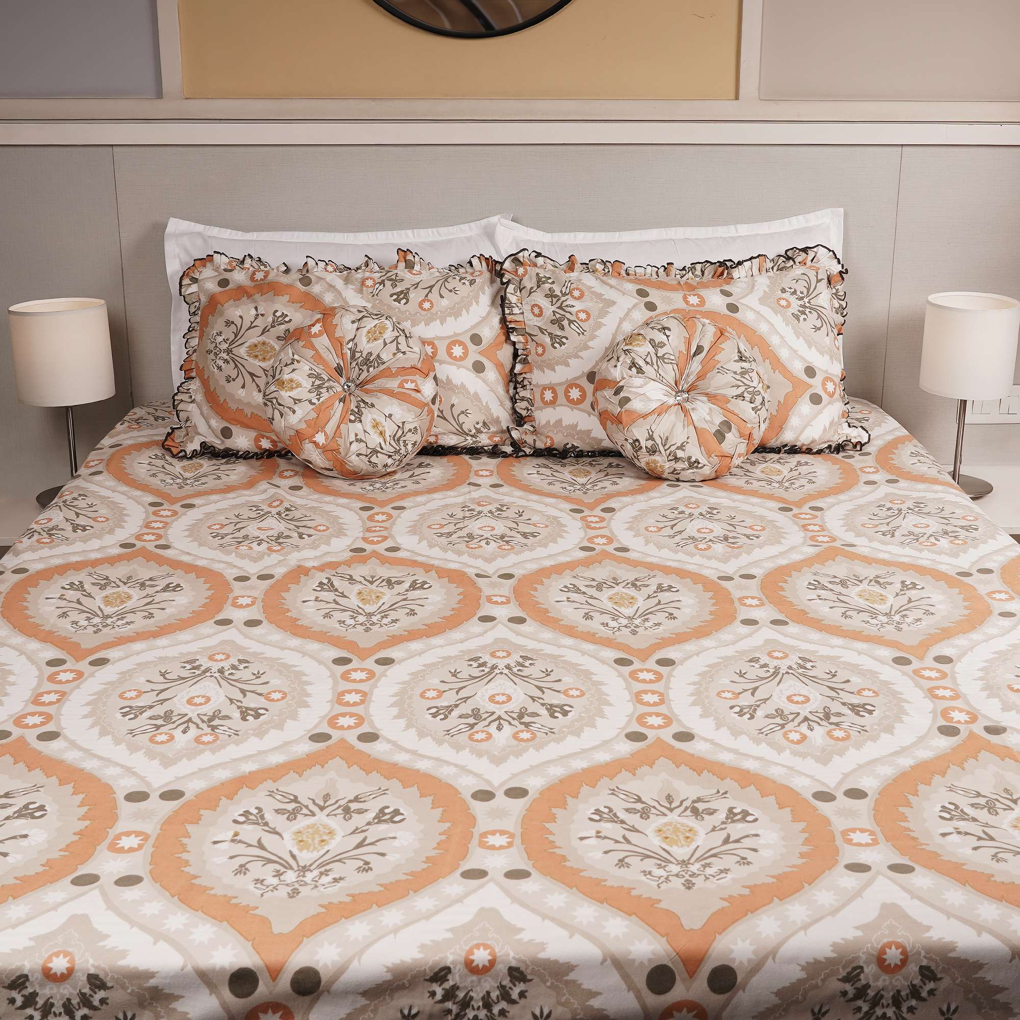 The Desert Medallion Bedding Set comes in soft neutral tones accented with warm sand and clay hues. The bed cover features repeating medallion motifs arranged in an all-over pattern, creating a balanced and composed look against a light base. The matching pillow covers mirror the medallion detailing and are finished with subtle edging, completing the set with a calm, coordinated aesthetic.