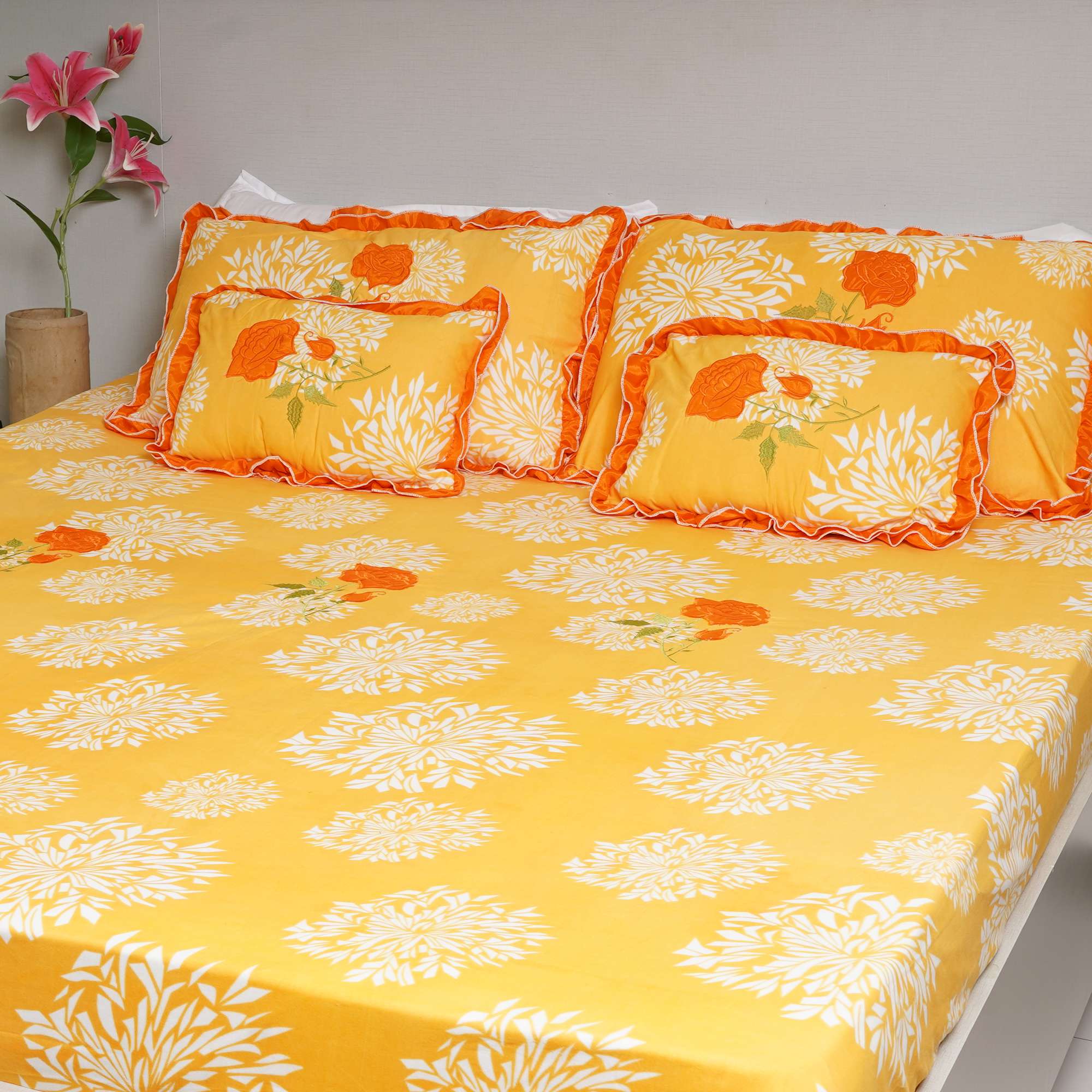 Honey Bloom adds warmth with a vibrant yellow base, soft white motifs, and embroidered floral accents in rich orange tones. Finished with elegant frill detailing and a smooth soft-touch feel, this set delivers cheerful comfort and everyday luxury.