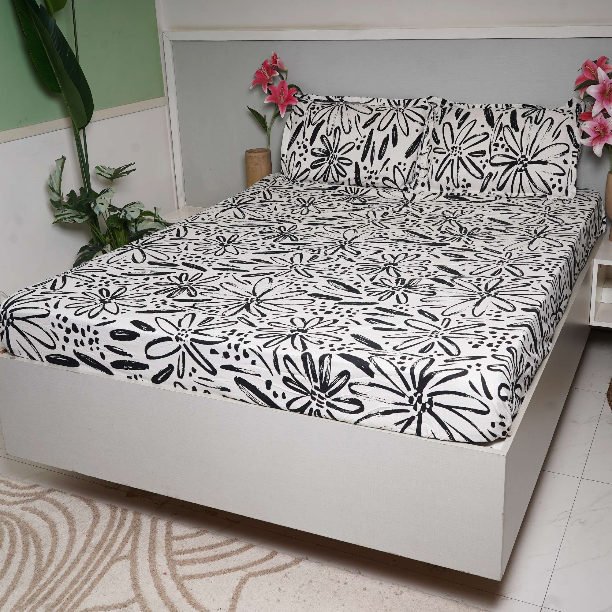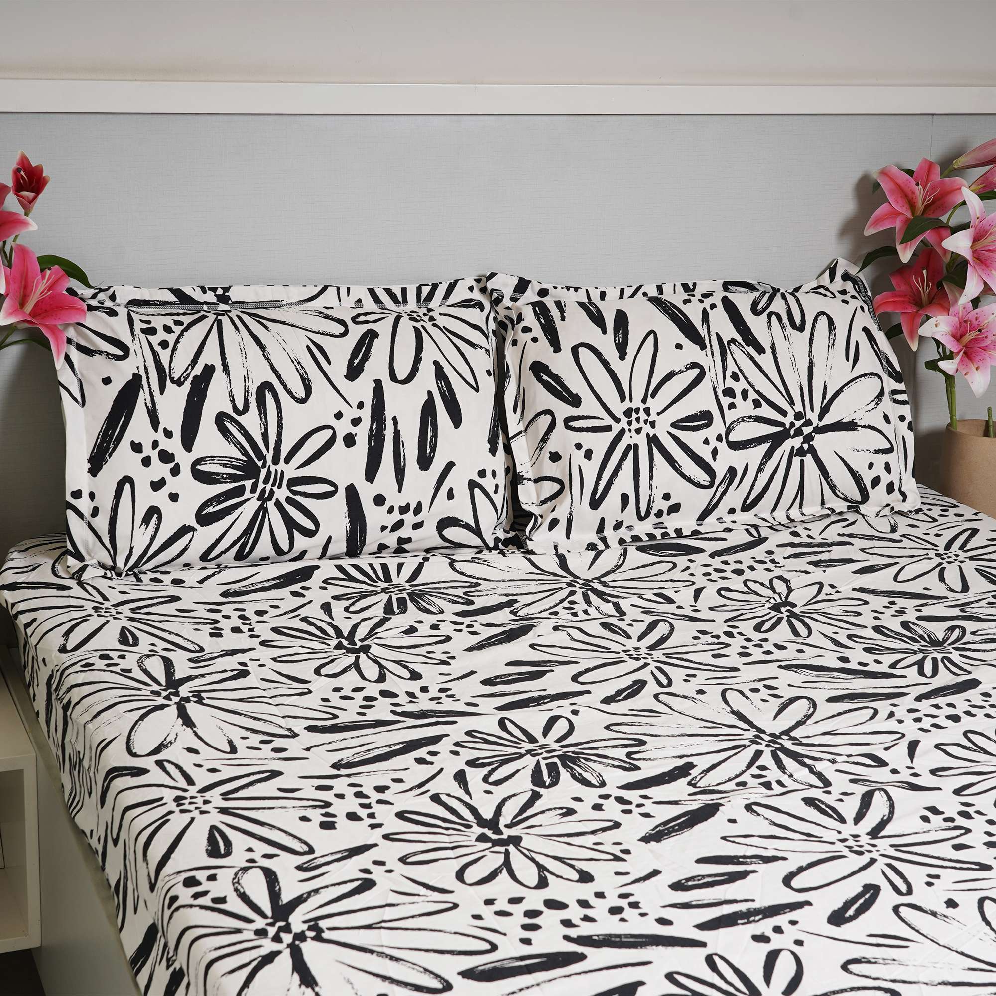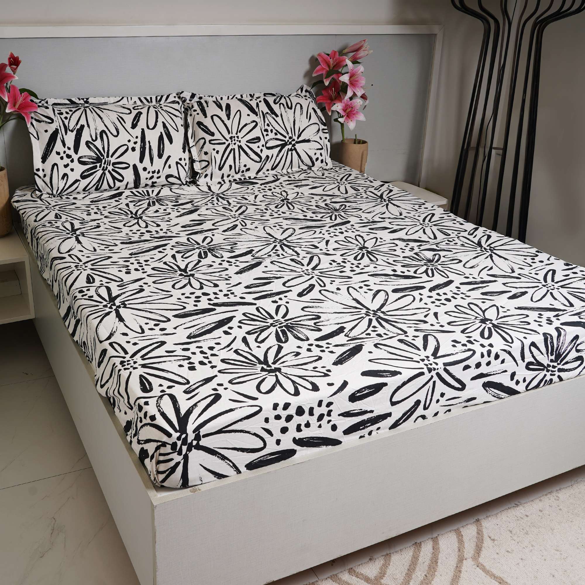 Mono Flora Cotton Bedding Set features a bold black-and-white hand-drawn floral print that brings a modern, artistic character to contemporary bedrooms. The fitted sheet ensures a snug, crease-free fit, while coordinated pillow covers complete the clean, stylish look.
