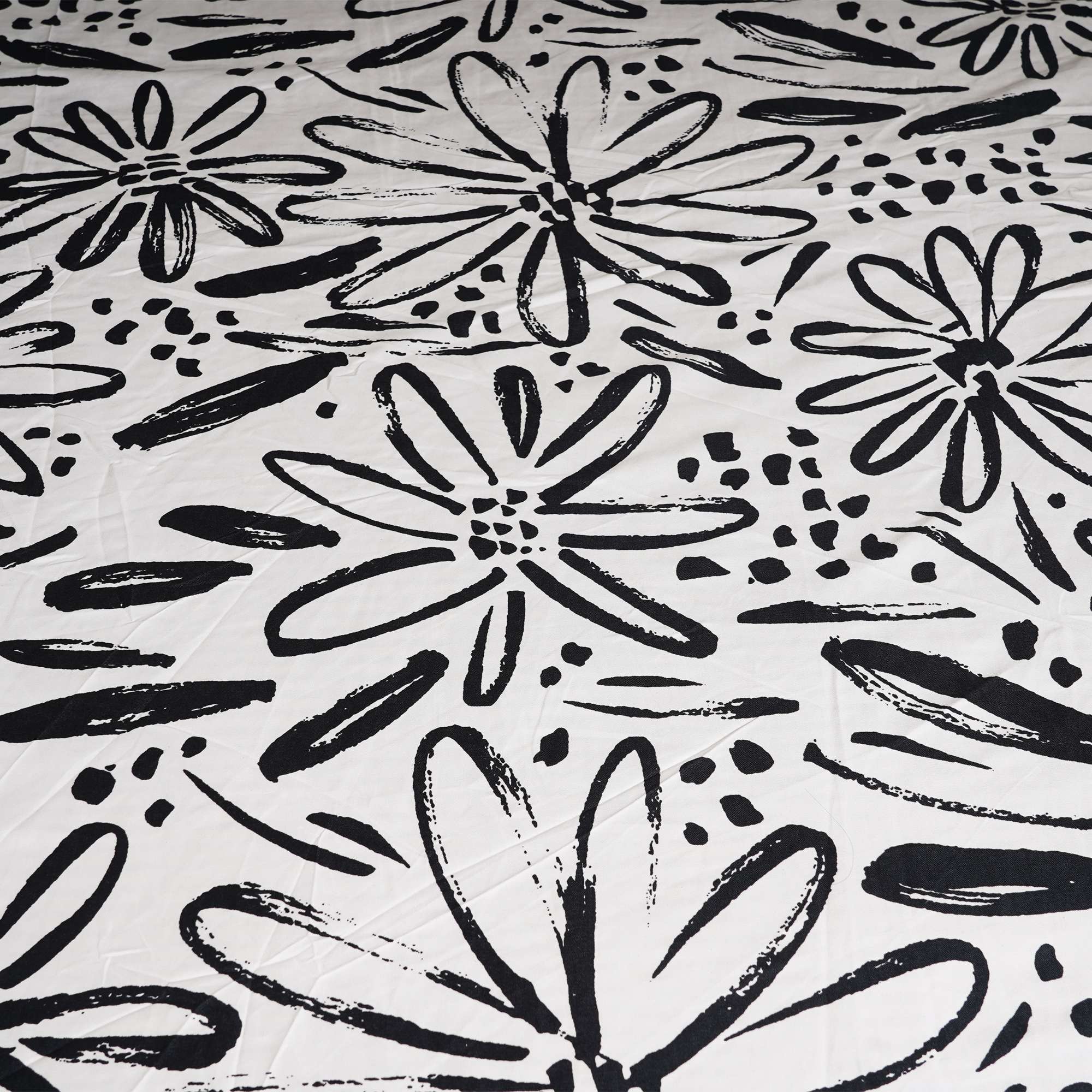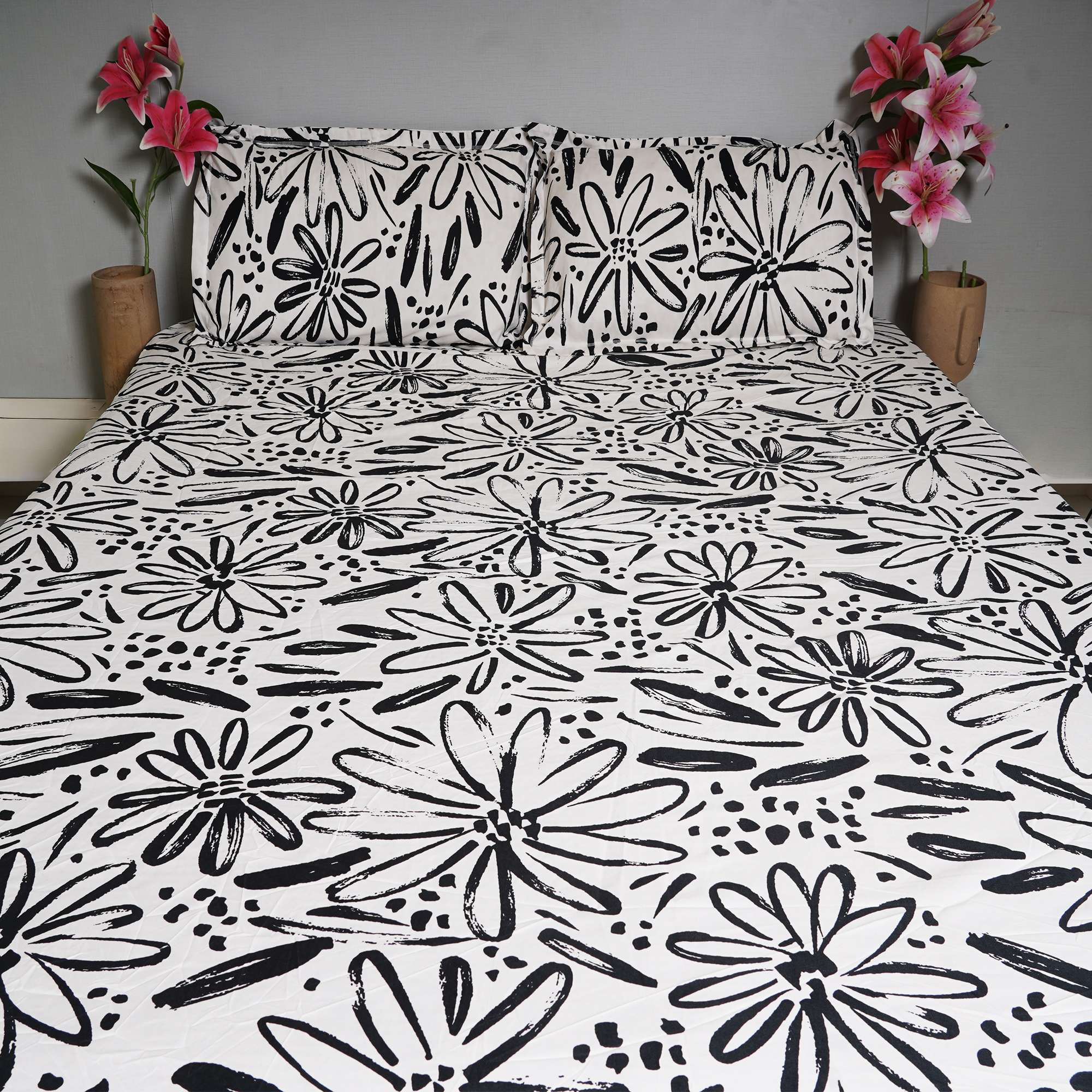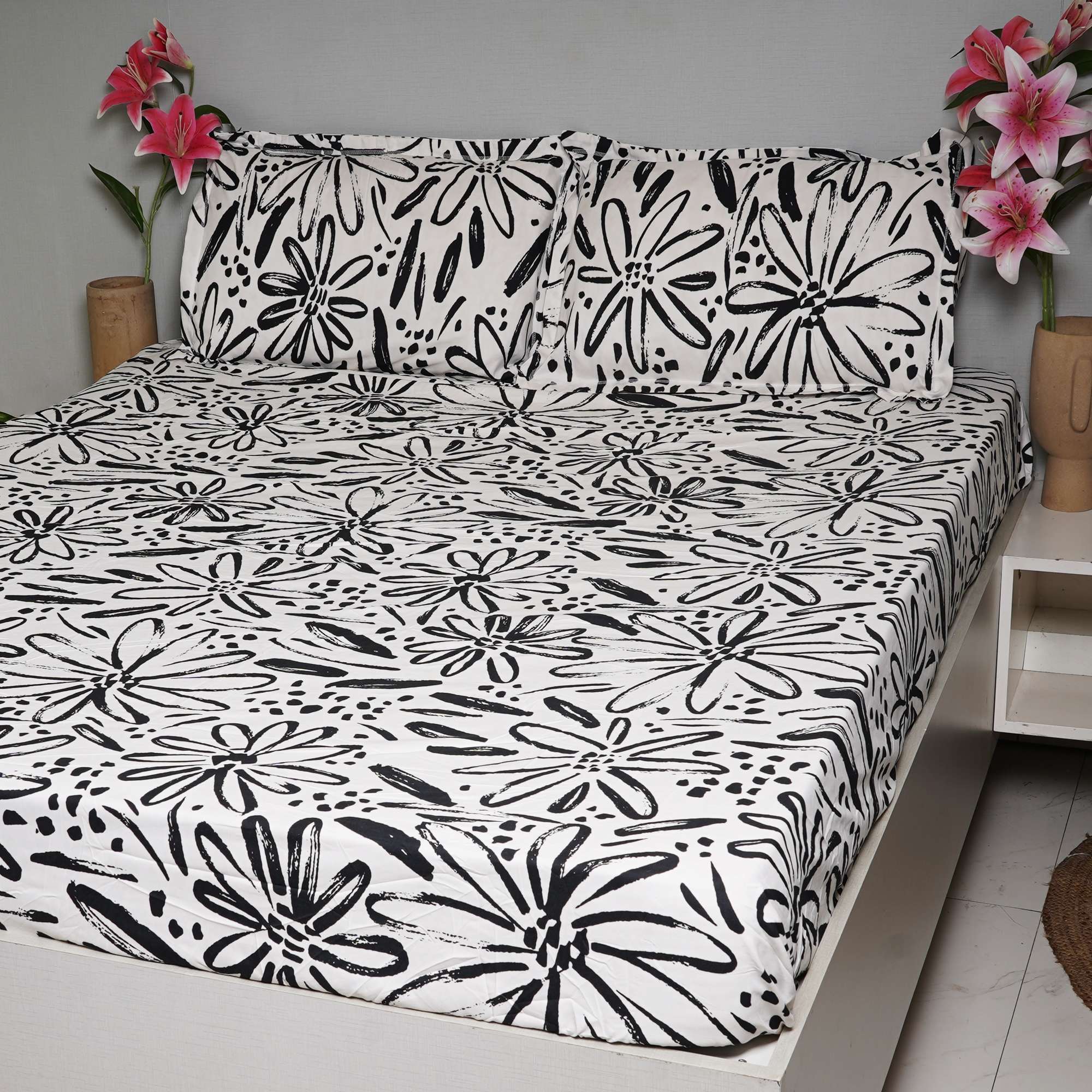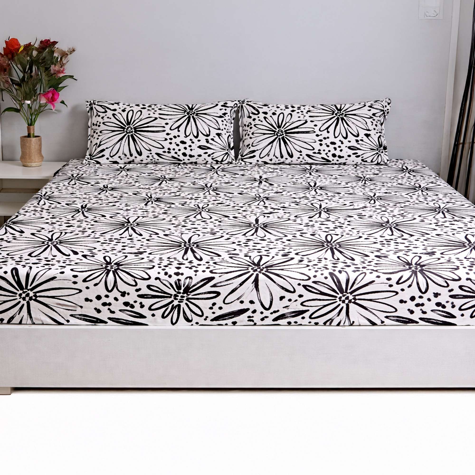 Mono Flora Cotton Bedding Set features a bold black-and-white hand-drawn floral print that brings a modern, artistic character to contemporary bedrooms. The fitted sheet ensures a snug, crease-free fit, while coordinated pillow covers complete the clean, stylish look.