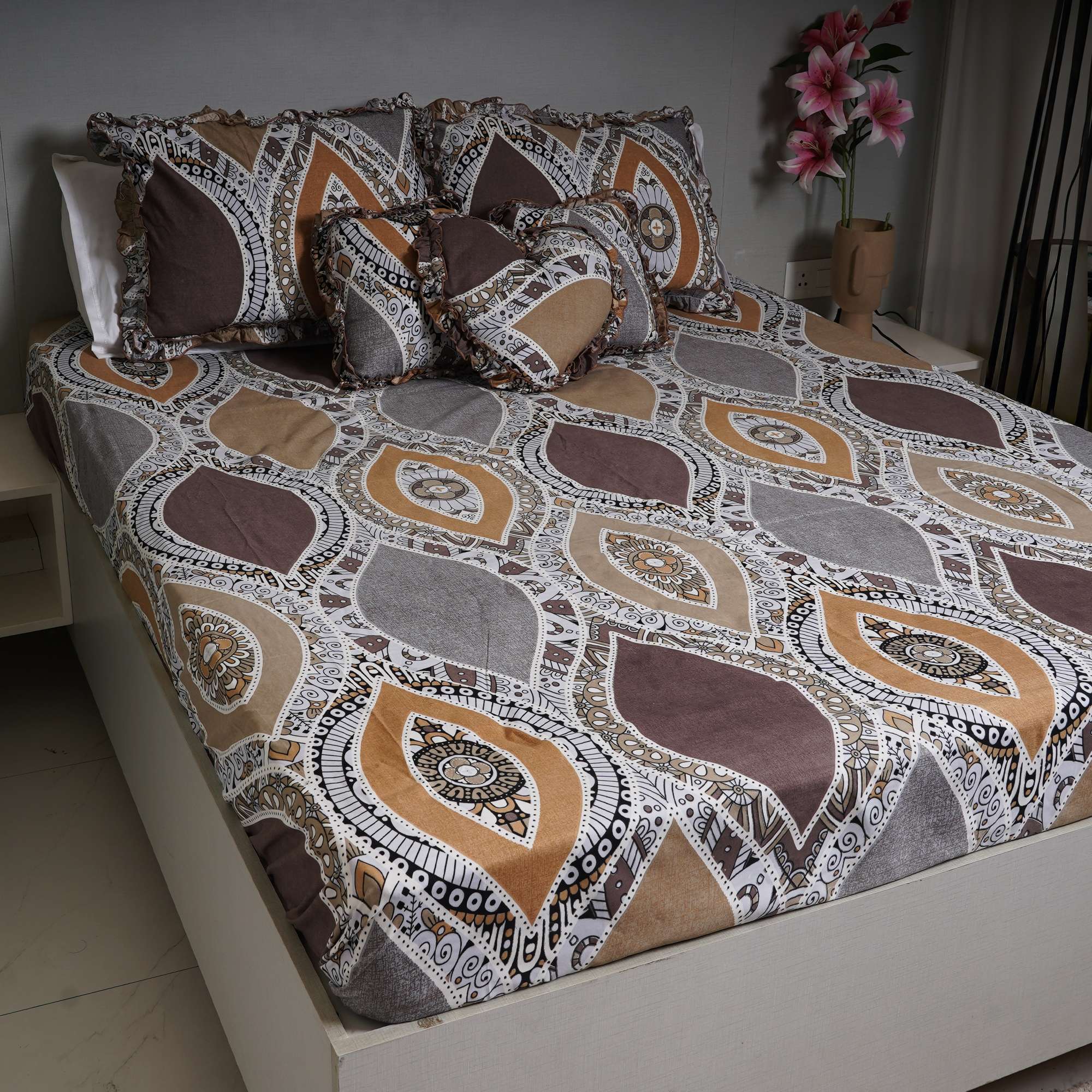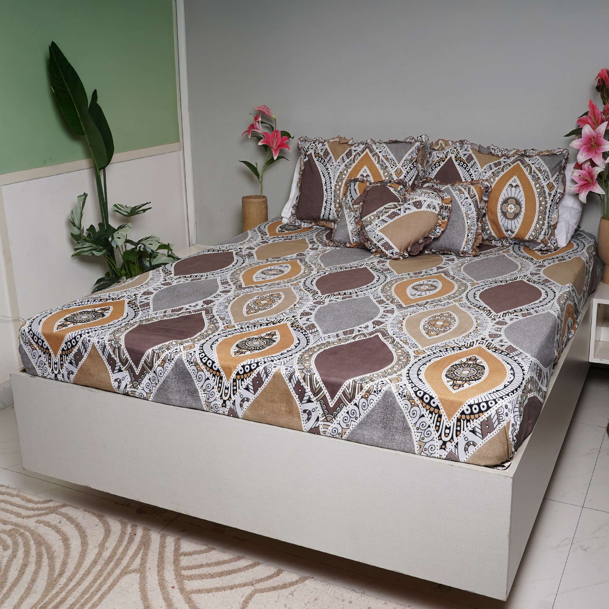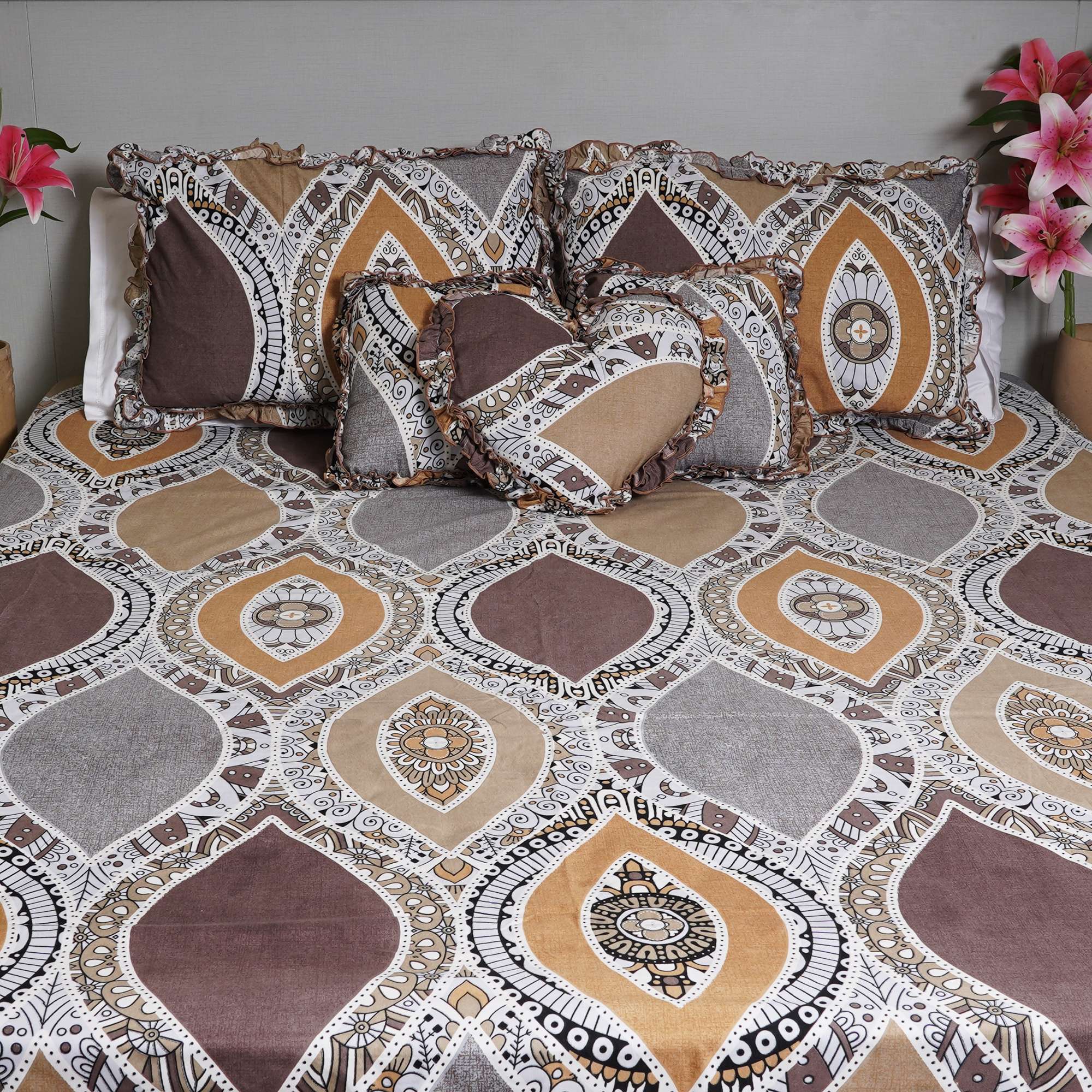 Rustic Charm blends medallion-inspired motifs with warm earth tones for a welcoming and expressive bedroom look. Frill-edged pillows and a heart-shaped cushion add softness, making it ideal for relaxed yet stylish interiors.