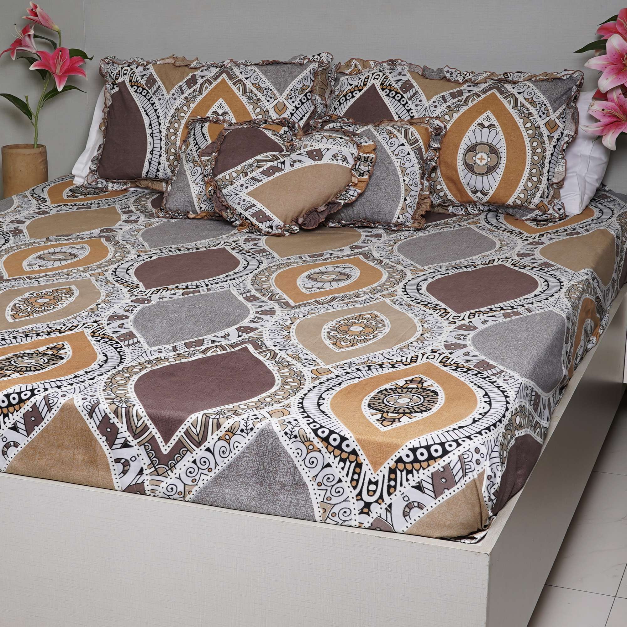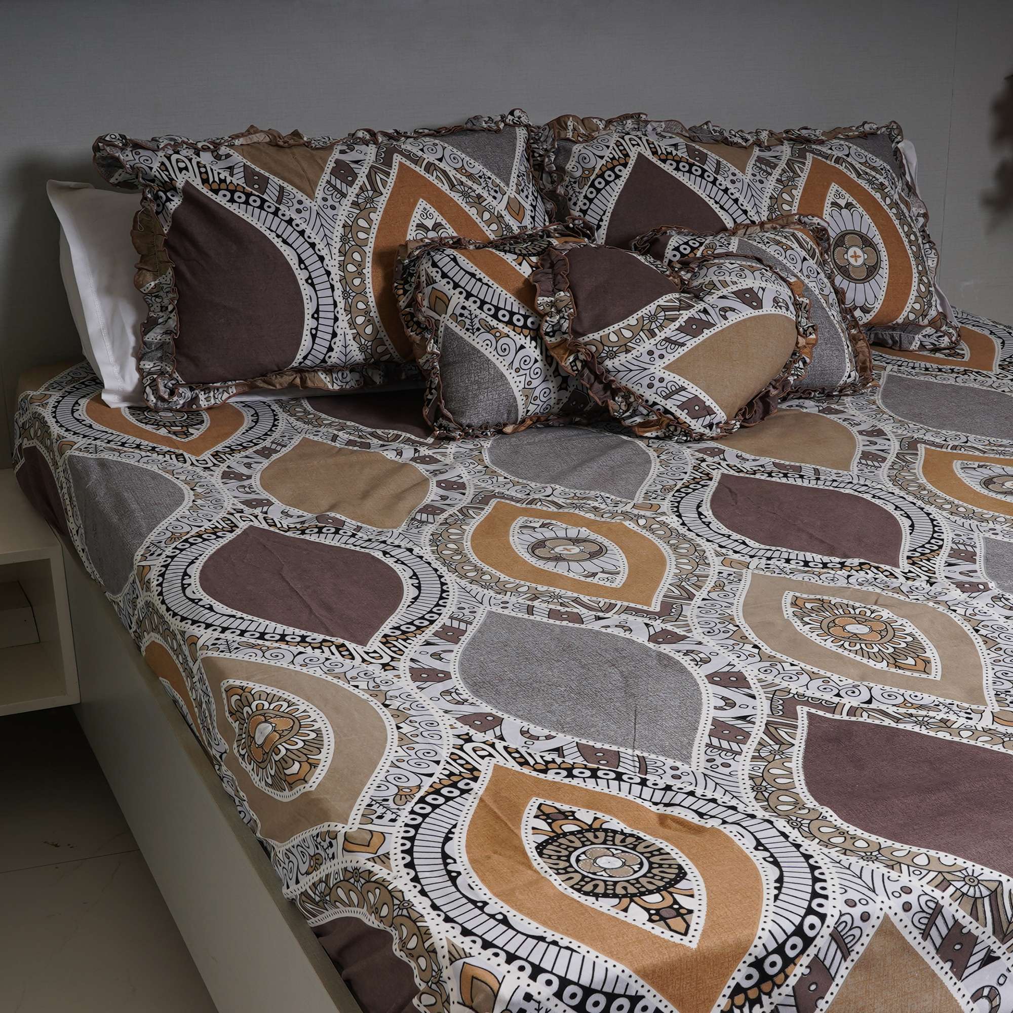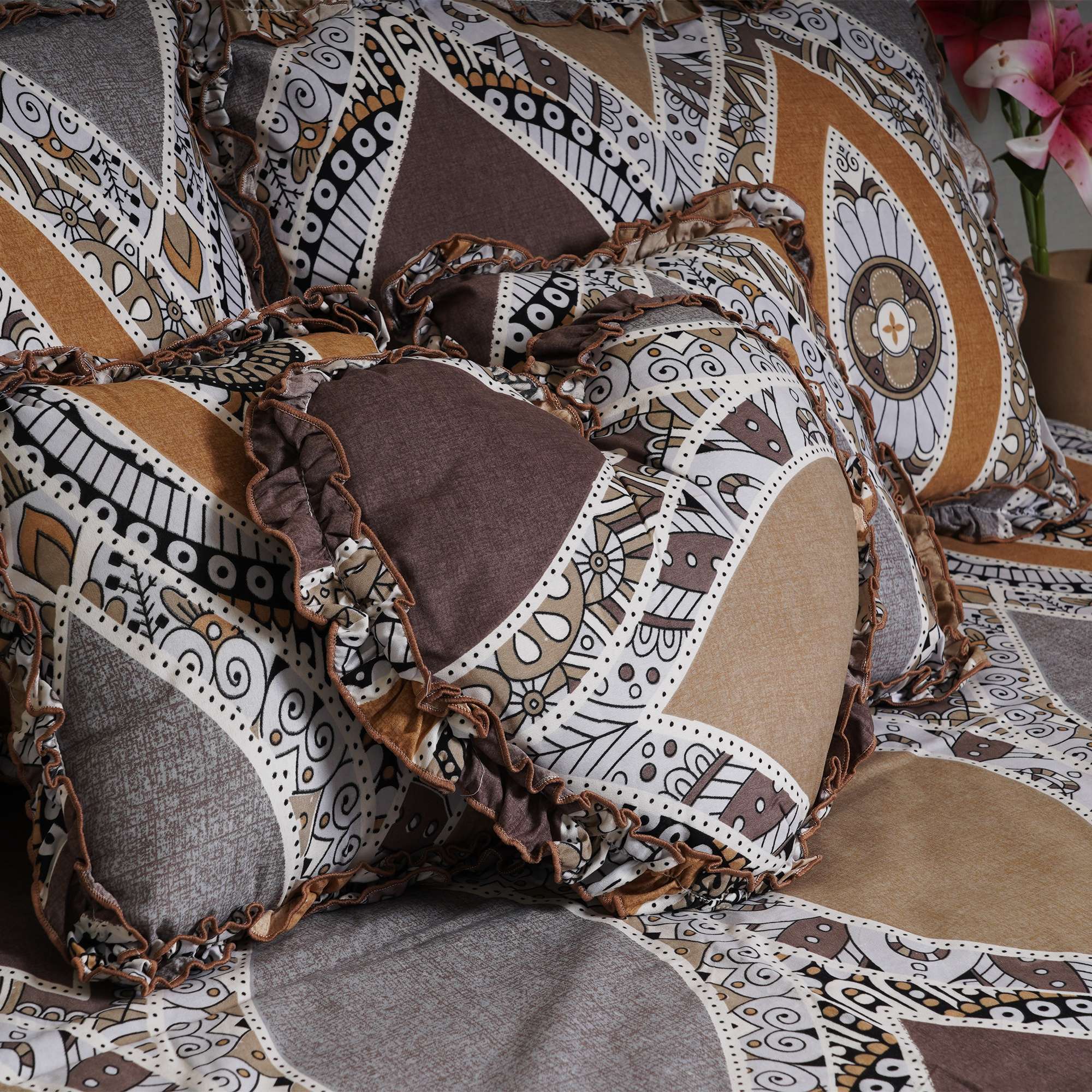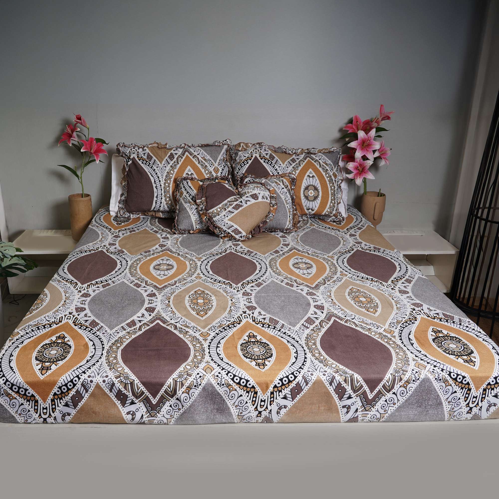Rustic Charm blends medallion-inspired motifs with warm earth tones for a welcoming and expressive bedroom look. Frill-edged pillows and a heart-shaped cushion add softness, making it ideal for relaxed yet stylish interiors.