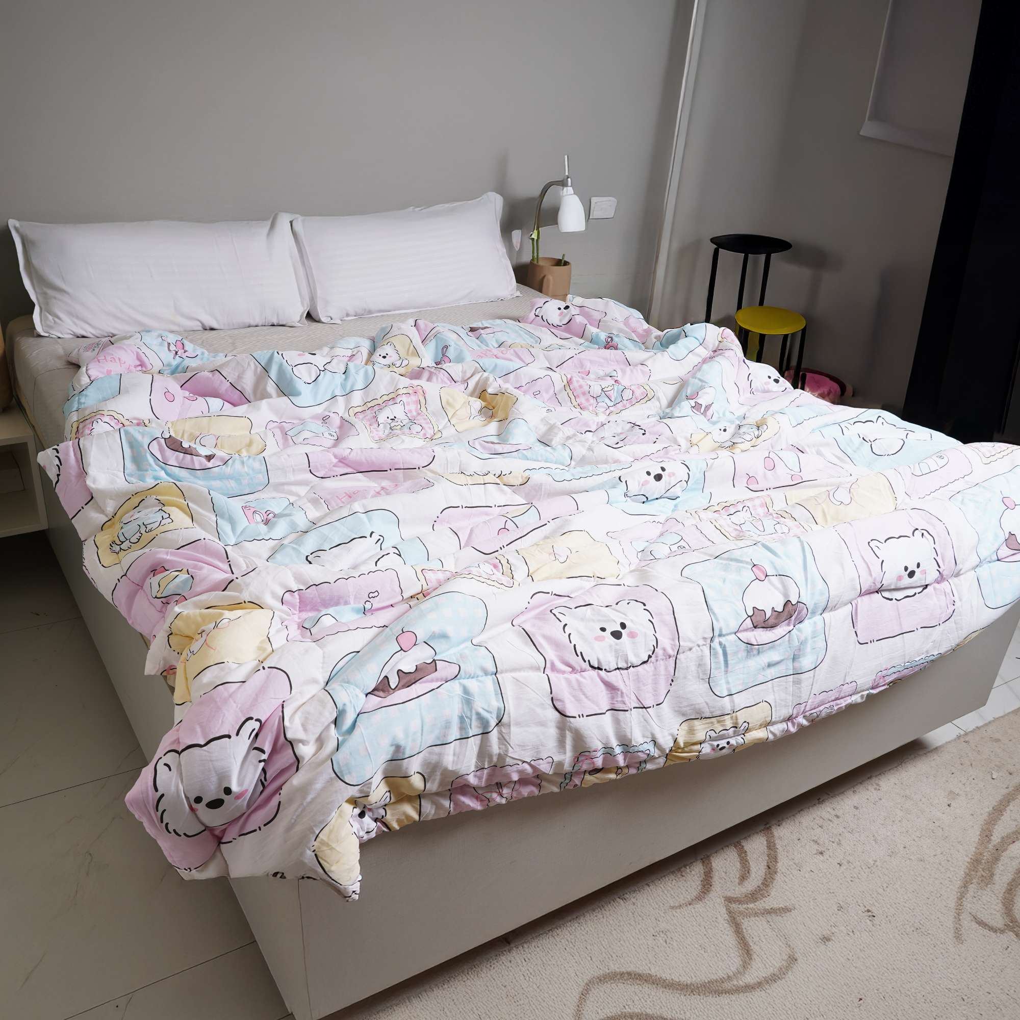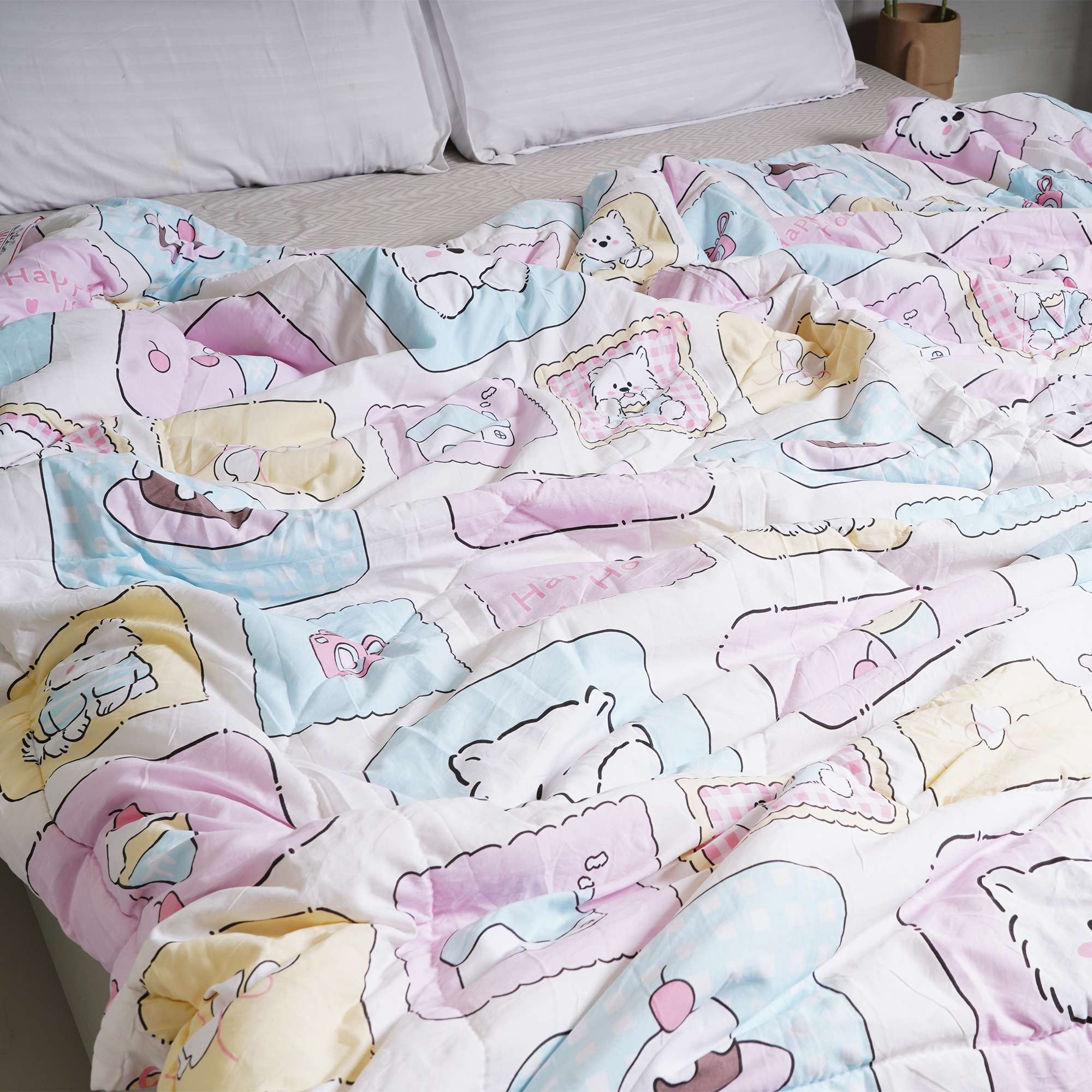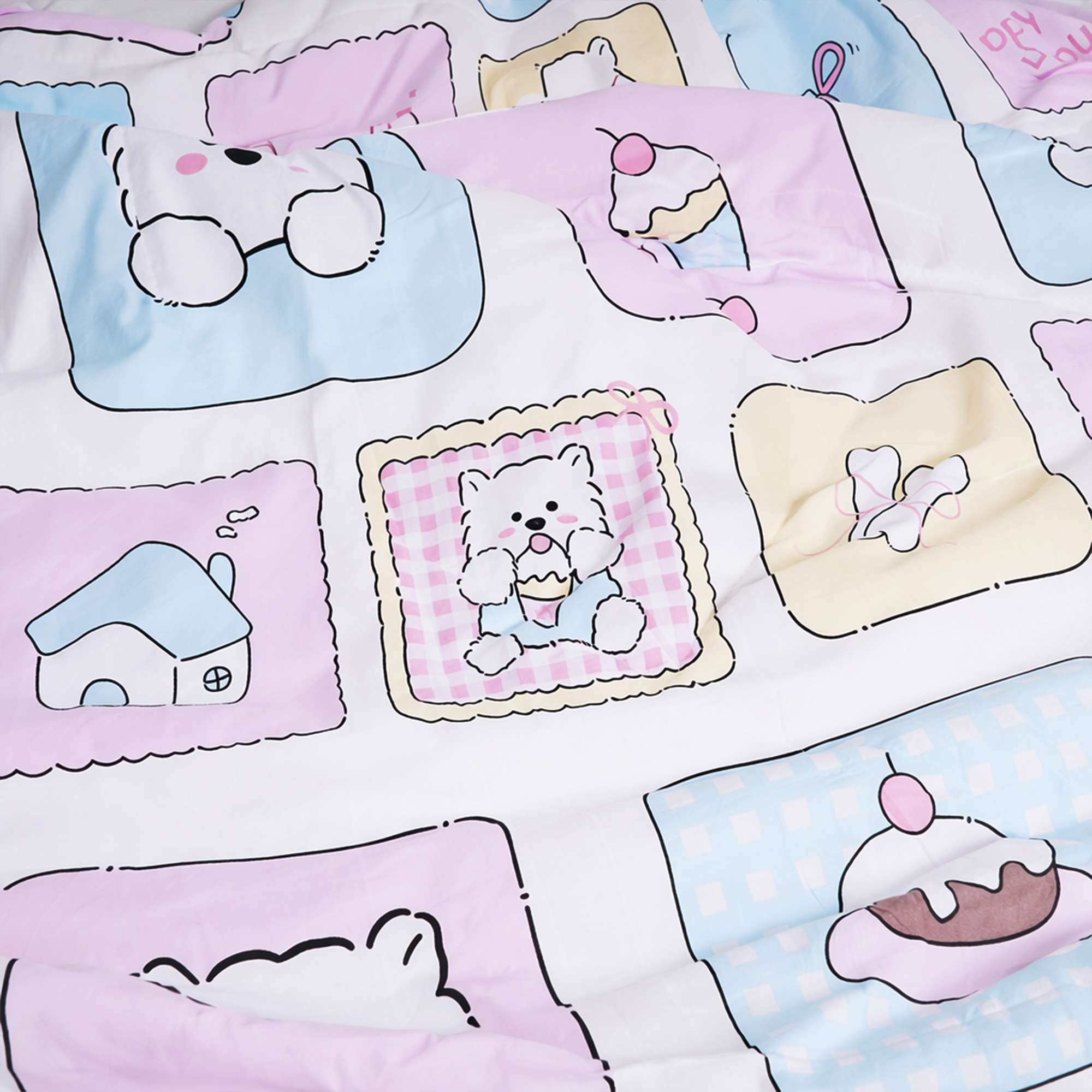 Teddy Tales Pastel Comforter features adorable teddy bear illustrations and playful dessert-inspired motifs in soft pastel tones. Crafted from gentle, skin-friendly fabric with lightweight quilting, it provides cozy warmth without heaviness—perfect for joyful, all-season comfort in kids’ bedrooms.